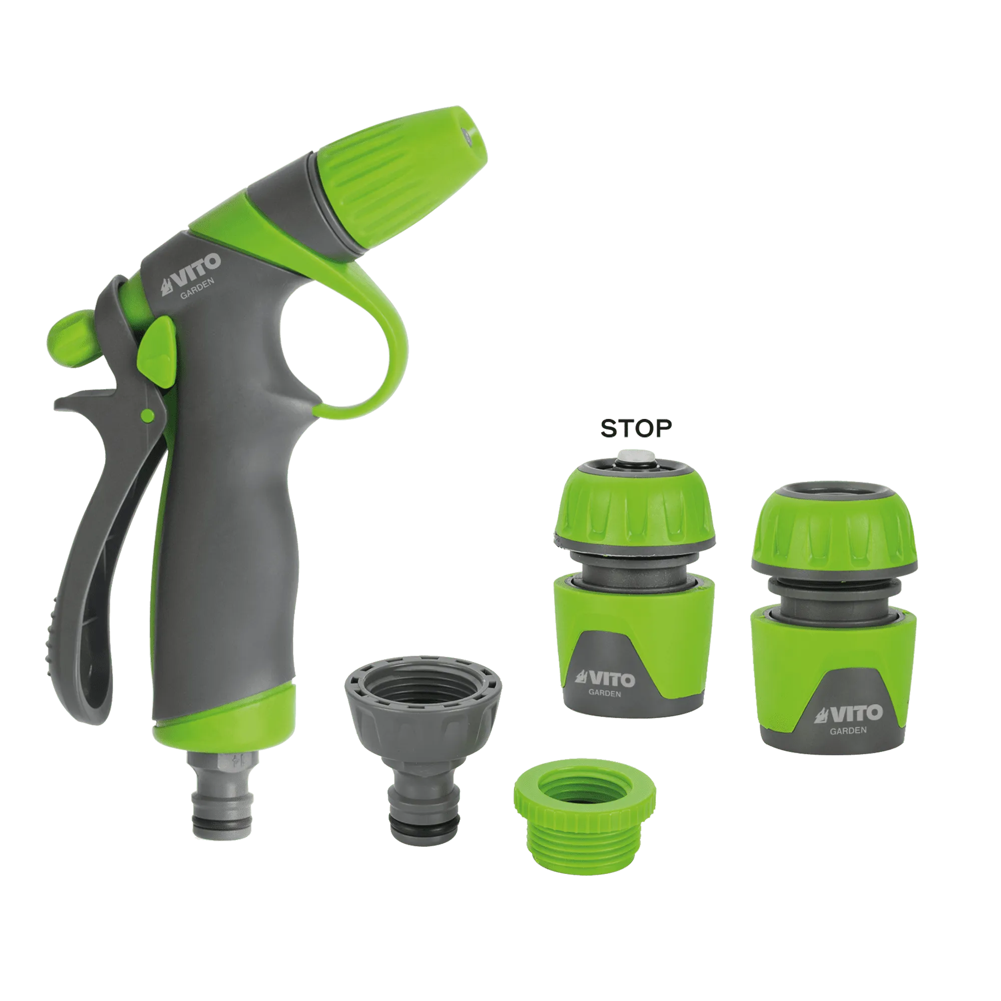 Kit pistola de riego con empuñadura de goma y acoplamiento rápido.